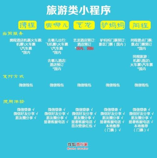 去哪儿则表示,针对不同产品线,去哪儿开发了单独的小程序,其中用户在小程序上做的预订,都可以在网站、APP等各个终端同步查询。用户可以把小程序作为APP的补充,也可以不下载APP,直接使用小程序完成包括预订、支付、客服等在内的各种功能。   有业内人士对微信小程序可能对旅游企业移动端APP带来的流量冲击表示了担忧。“如果用户习惯了使用小程序作为入口,意味着大量的流量入口被微信收入囊中,长期来看对于目前流量已经成熟的APP来说并不是一件好事。”   携程方面认为,“短期内小程序不会对携程的移动端APP产生影响,而会成为另一个用户触达携程的重要入口,反过来扩大携程的用户群。”对于长期可能带来的流量影响,携程和去哪儿方面未予置评。   而对于本身没有移动端APP流量入口,又有着优质产品需要展示的中小旅游企业来说,简单易用的微信小程序带来的无疑是一阵借之而无后顾之忧的东风。所以对于中小企业来说小程序的机遇非把握不可。   对于用户来说使用旅游小程序的优势就更明显了。   1、如果你是不怎么经常关注旅游,关注出行的那类人,那么这个不占手机内存的不到1M的小程序最适合你,偶尔有需要买张机票,不用另下APP,在小程序上直接下单就可以了。    2、如果你临时兴起想去附近的景区逛逛,再也不用在网上百度半天了,下载各种APP软件到手机上查找,无聊的时候刷刷小程序,里面会有很多旅游策略供你选择,旅游就是这样,说走就走,在不经意之间。    3、当你到旅游景点,但是到了景区门口又被前面长长的购票队伍吓着了,那么
